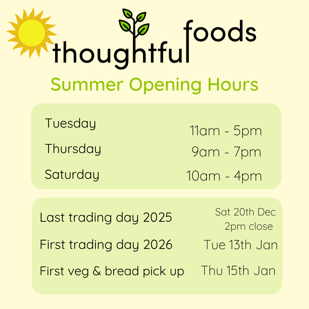 Note: Thoughtful Foods is a 100% volunteer-run shop :) This means that, on occasion, opening hours may change at shorter notice than you might expect with other shops. If opening hours change, they will be updated on this website.